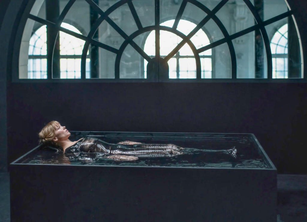 Then we have the science fiction scenes that take place in the future, at a time when the world is run by artificial intelligence. Computers are hard at work trying to scrub all emotions from Gabrielle’s DNA, including her existential angst, which she has been carrying around with her “for centuries,” according to the voice speaking to her. Inexplicably, however, the erasure treatment doesn’t work in Gabrielle’s case. This process, which begins with a robot arm injecting a needle into her ear, takes place with Gabrielle dressed in a black latex bodysuit and immersed in a bathtub filled with a black liquid. Why is she so resistant to treatment? Well, I suppose it’s because her “hidden beast” is even stronger than AI.