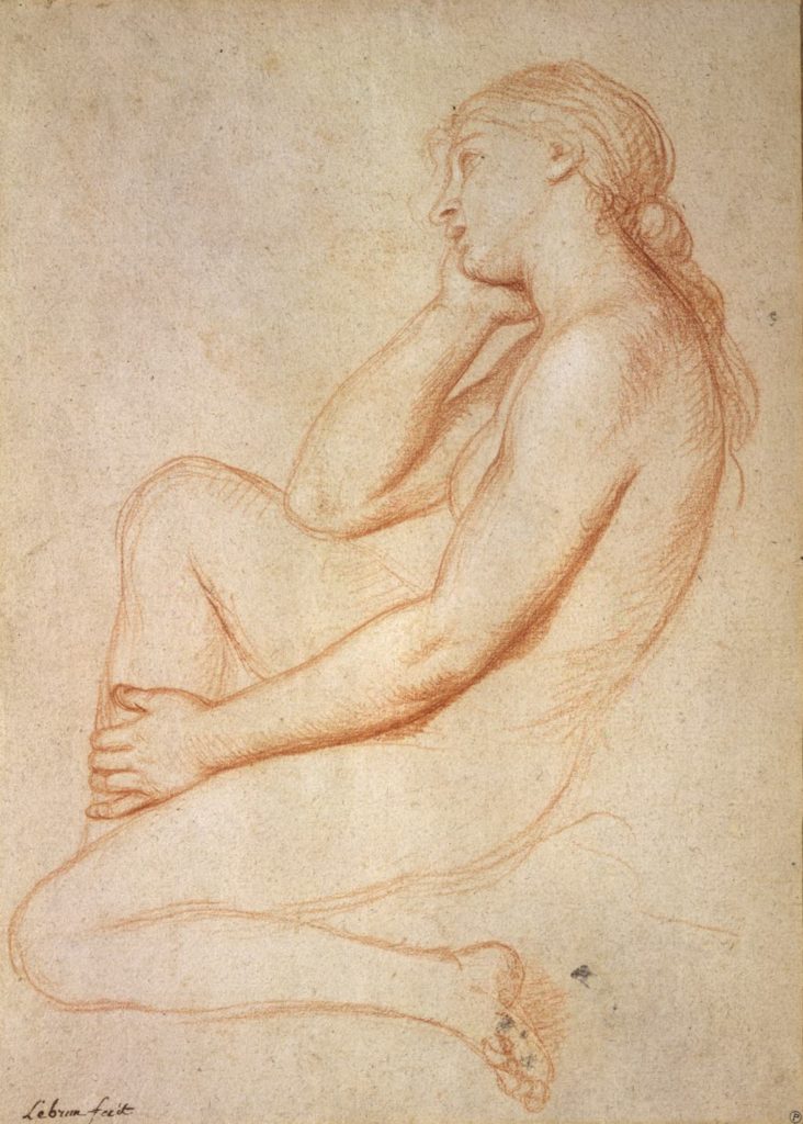 Back in France, artists were working hard to please the king, most notably Louis XIV’s court painter, Charles Le Brun, represented by a number of works, including a moving red-chalk drawing of a pensive nude, her head leaning on her right hand. This figure reappears, clothed, in some of Le Brun’s paintings.