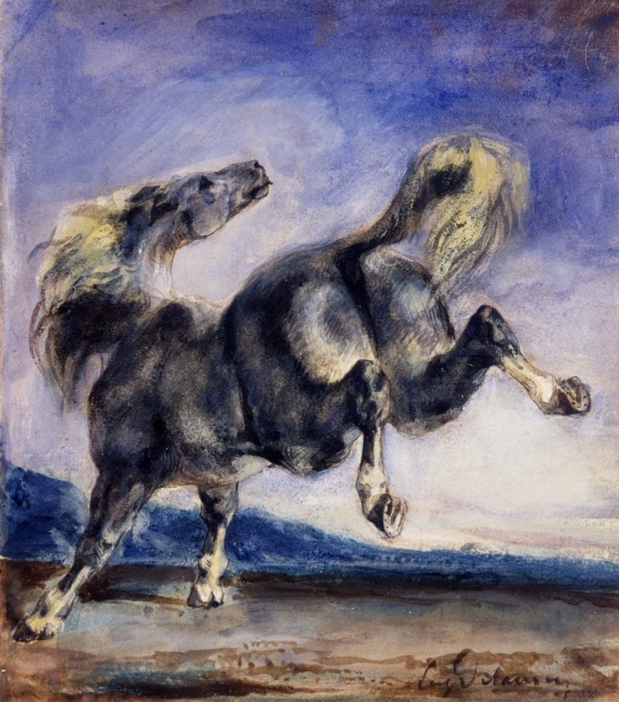 Jacques-Louis David spearheaded the return to antiquity with his neoclassical works, but that style soon gave way to Romanticism, notably represented here by a large group of drawings by Eugène Delacroix, including the wonderful “Wild Horse” – later purchased by Degas for his private collection – and a number of evocative sketches.