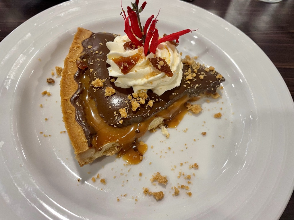Dessert was a sinfully good chocolate and caramel tart with a rather hard but tasty shortbread crust.