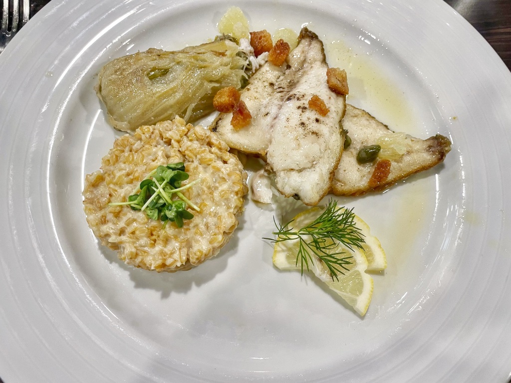 The main course was more elaborate: two nice-sized pieces of pan-fried dorade (sea bream) in a sauce grenobloise, made with butter, capers, confit lemon and croutons. The delicious sides were braised fennel and a rich einkorn-wheat risotto.