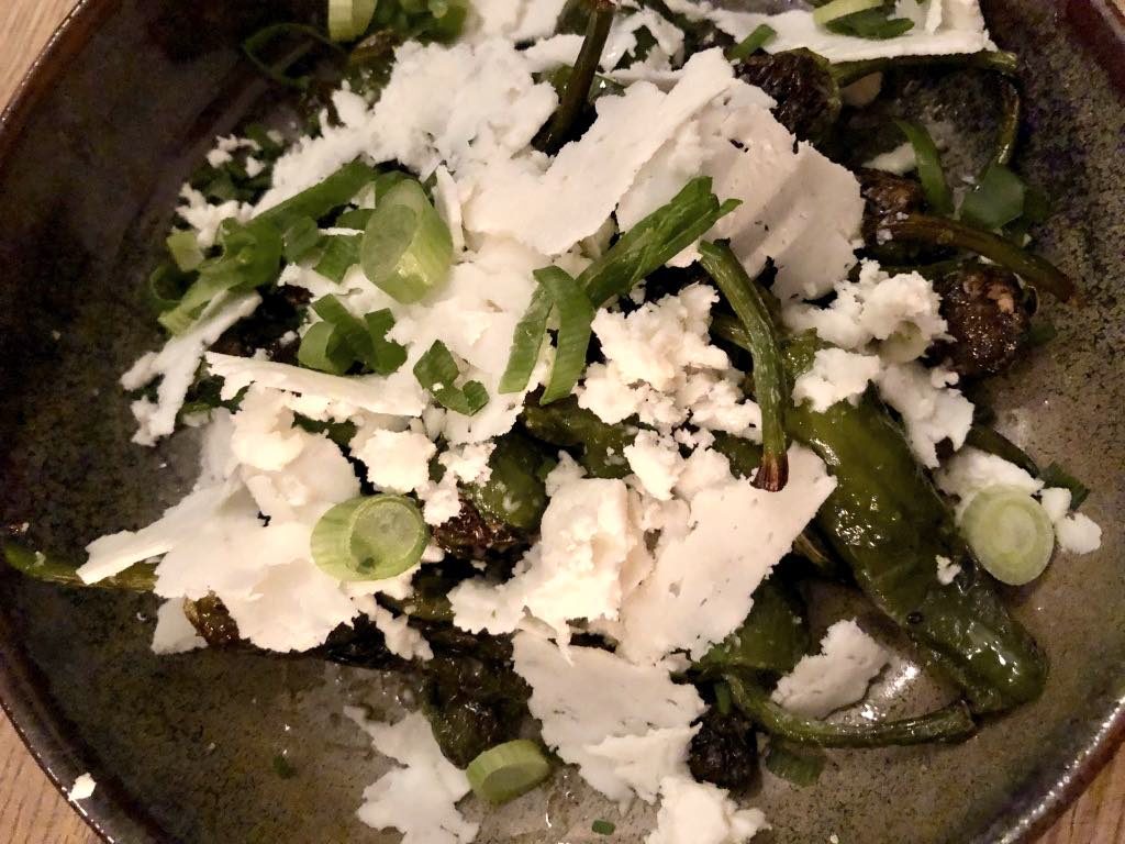 The other savory dish was pimientos de Padrón, those fried Spanish green peppers that are showing up on menus all over Paris these days, but here they were dressed up with feta cheese, scallions, honey and wildflowers. It worked beautifully.