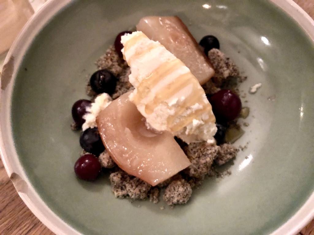 The real surprise, however, was the sensible-sounding “fruit” dessert: poached pears with bergamot ice cream, bilberries and black-sesame crumble. A brilliant combination, not sensible at all.