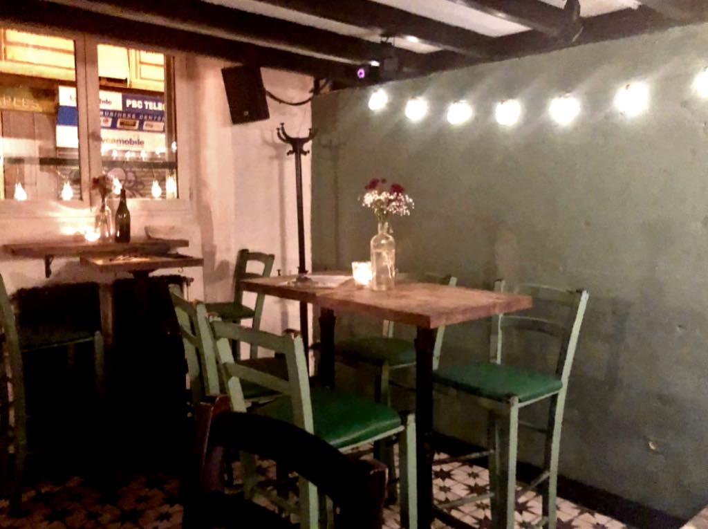 The decor is simple and cozy, with a small wooden bar, shelves with a few books and bric-a-brac, and festive strings of lights. There are tables on three levels: upstairs, downstairs and in the middle, so that each area has its own atmosphere. The friendly servers easily kept up with all of them.