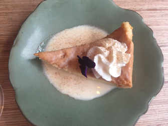 with coconut, pink cookies from Reims, yuzu and strawberries, prettily topped with a violet flower and a strawberry, and a tres leches (three-milk) cake.