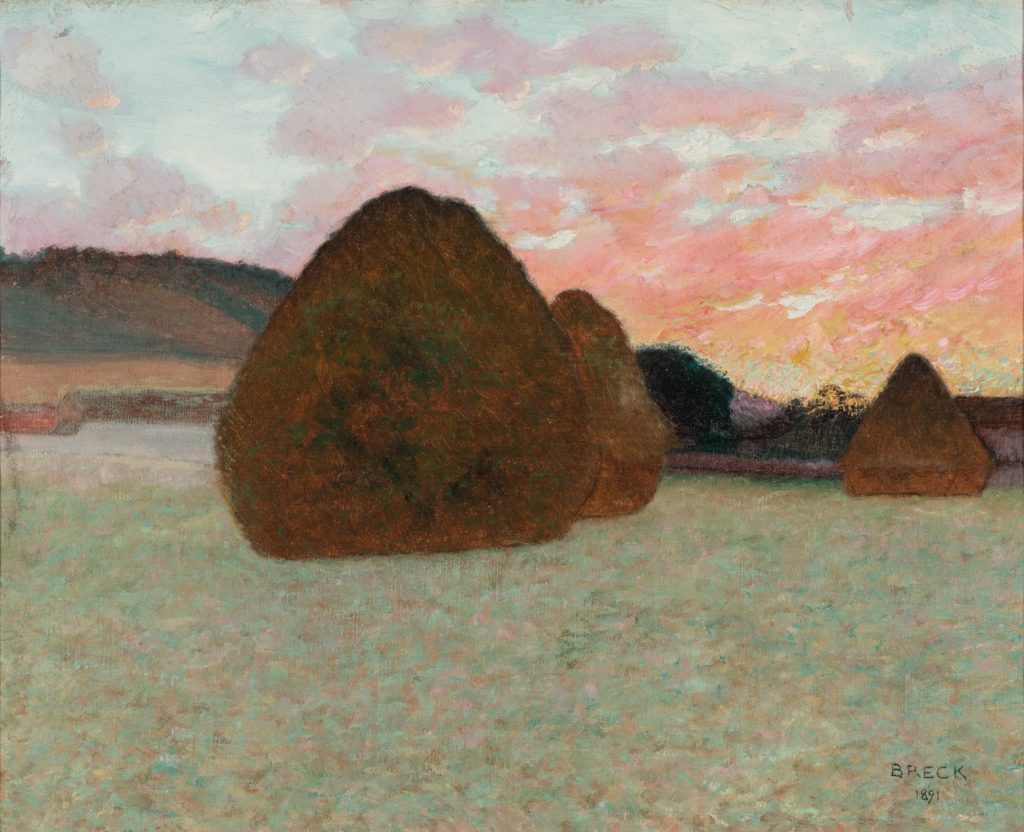 A number of talented New World Impressionists, including Willard Metcalf and Theodore Robinson, are featured in the exhibition. One of them, John Leslie Breck, adopted Monet’s habit of painting the same subject – in this case, haystacks – at different times of day and in different light. His 12 haystack studies and a larger painting based on one of them are presented in the show. They are lovely enough to stand on their own, and while they are not imitations of Monet’s series, the comparison is inevitable. Breck, who was a friend of Monet, is credited with introducing Impressionism to the United States when he returned there in 1892 after leaving Giverny, where his relationship with one of Monet’s stepdaughters had met with the disapproval of the master.
