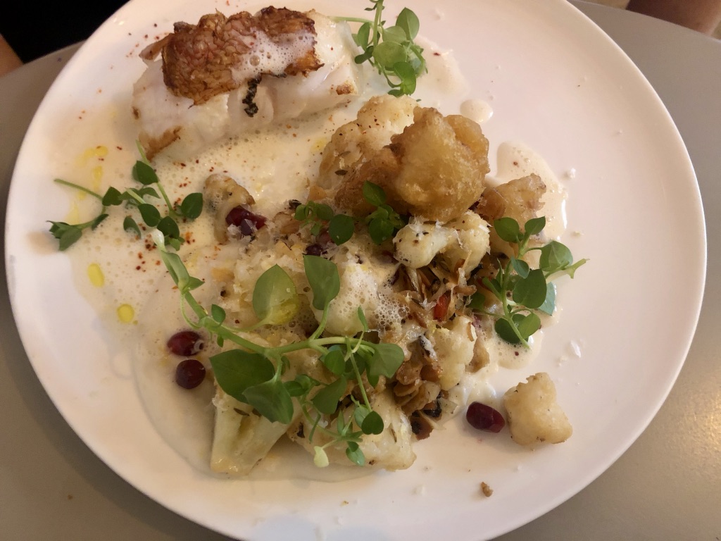 French-style hot dishes are also available at mealtimes. Terry ordered the rascasse with cauliflower (cooked tempura-style), a foamy citrus sauce and pomegranate seeds. She enjoyed it but didn’t seem overwhelmed with joy.
