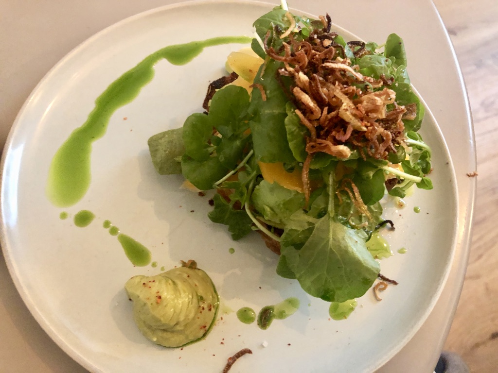 I chose two small plates instead of a starter and main course. Although I love avocado toast, I wasn’t going to order it because it’s something I can make so easily at home, but Terry pointed out that it would be much fancier in a restaurant, so I decided to try it. She was right – nothing like my simple mashed avocado on toast with a sprinkling of chili powder. The bread was cornbread, buried under a mountain of good things: ripe-to-perfection avocado, Mimolette cheese shavings, watercress and crispy fried onions. On the side was a spicy avocado sauce. All the various flavors blended and contrasted nicely.