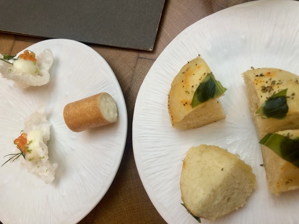 We were seated in the winter garden and given extra-special attention by the sommelière and the various waiters and busboys. They started us off with two amuse-bouches: crispy tubes filled with Comté-flavored cheese and cauliflower-cream dumplings topped with salmon roe, accompanied by light and fluffy little focaccias with an olive-oil-soaked basil leaf on top.