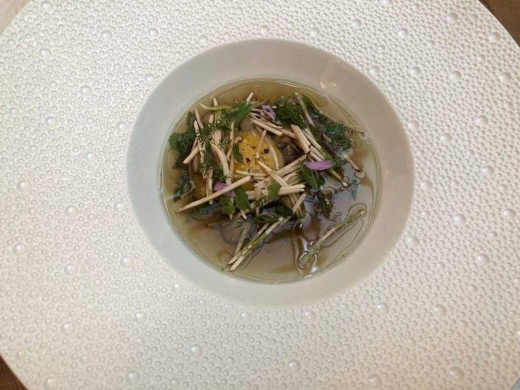 So, the first course for both of us was a free-range egg in a delicate cep-infused bouillon enriched with lardo di colonnata, with tiny mushroom sticks floating in it. Lovely.