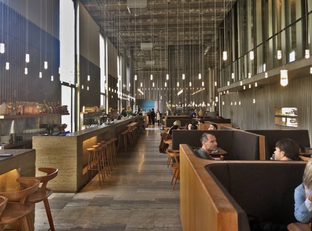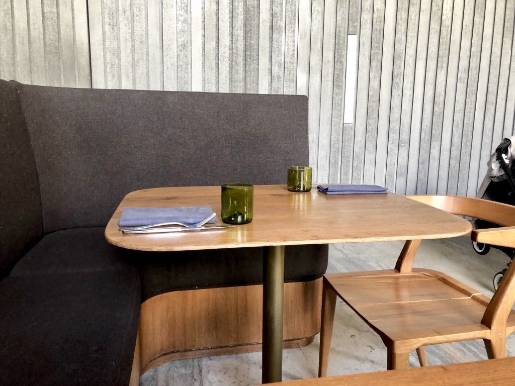 In spite of its concrete structure, high ceilings and gigantic windows, the restaurant is almost cozy thanks to its chic decor, featuring brown-upholstered wooden booths and handsome wooden tables and chairs. Light floods in from the windows, and a flock of cute little hanging light fixtures twinkles under the ceiling. Design credit goes to architect Lina Ghotmeh.