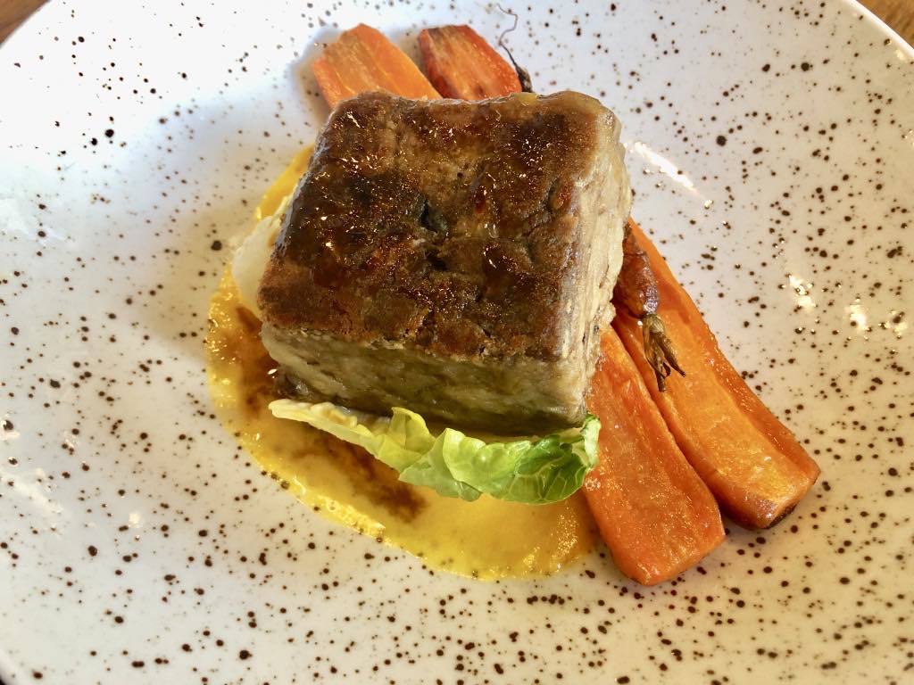 The main course was tender, deeply flavored pulled lamb reconstituted into a square and served with grilled carrots, which were a delight, especially the caramelized baby ones.