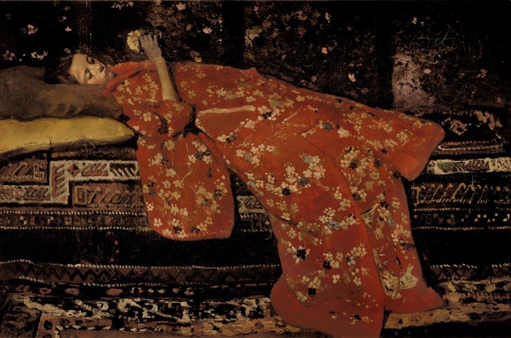 A number of less-familiar artists are included in the show, among them the talented Hague School landscape painter Jacob Maris, who was strongly influenced by the Barbizon School painters when he lived in France, but for me the most interesting discovery was the work of George Hendrik Breitner (1857-1923). He is described as an Impressionist, but most of the powerful paintings here are of figures painted indoors and all have dark, moody palettes. In “À Bord” (1897), three women sit on a boat wearing voluminous white skirts and big white hats, which they hold on with their hands to prevent them from blowing away in the wind. Their faces are featureless. What might have been a whimsical subject is turned into something menacing by the figure of a man in a long dark coat looming in front of them. Breitner’s monumental painting “Le Cheval de Montmartre” (1884), a striking night scene featuring a dejected-looking horse, has a similarly sinister atmosphere, while the striking “Le Kimono Rouge” (1893; pictured above), is a symphony of patterns suffused with melancholy.