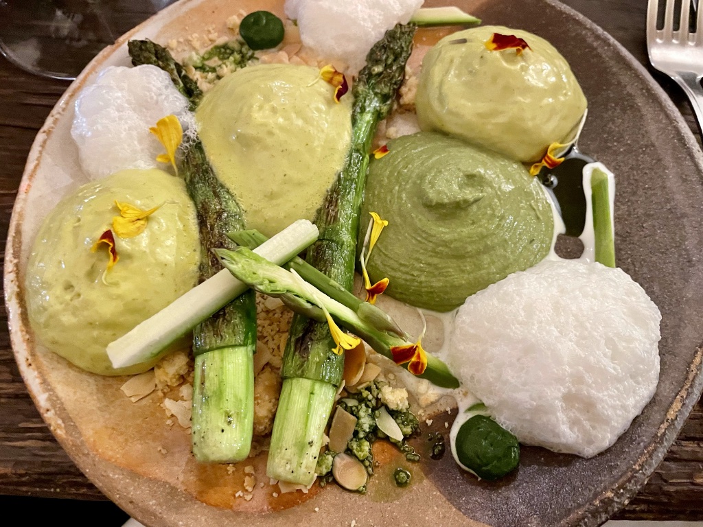 What did not need forgiveness was the food. The menu is short but seasonal and well-seasoned. We sampled three starters. One was asparagus, currently on the menu of every restaurant that cares about such things, although in meager portions because it is so expensive. Here we had two large stalks of perfectly cooked green asparagus and a couple of small raw ones for crunch, surrounded by mounds of creamy accompaniments, including basil zabaglione and almond foam.