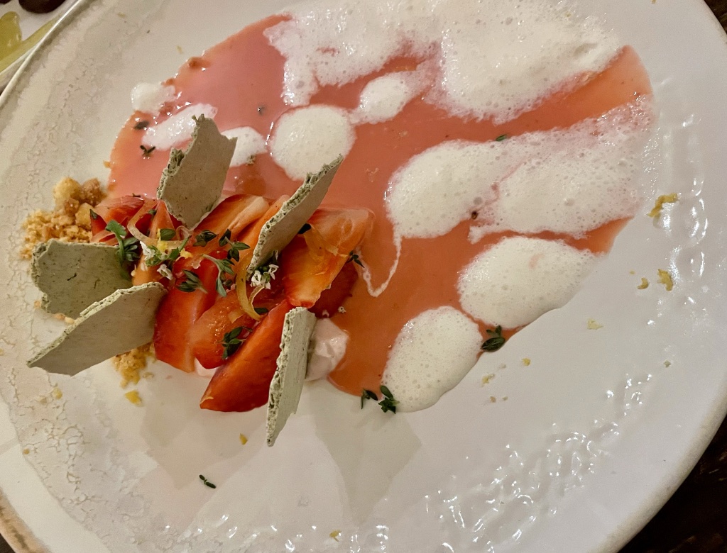 Far more popular among the three of us was the stunning dessert of strawberries with thyme, Crémet d’Anjou (a creamy dessert from Anjou), strawberry sauce and lemon crumble. Refreshing and totally satisfying to the sweet tooth without being too sweet.