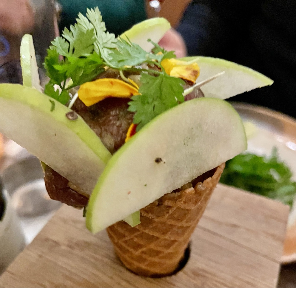 Marco had a real star of a starter, the restaurant’s signature dish: knife-cut beef tartare seasoned with chili lime. We were a bit confused when he was served a plate that appeared to contain nothing but a pile of fresh coriander. Minutes later, an ice cream cone decked out with flowers, parsley and apple slices appeared, adding to the confusion. The server instructed him to turn it upside down on his plate, crumble up the cone on top of the contents and mix it all together. A clever way to serve an excellent tartare.