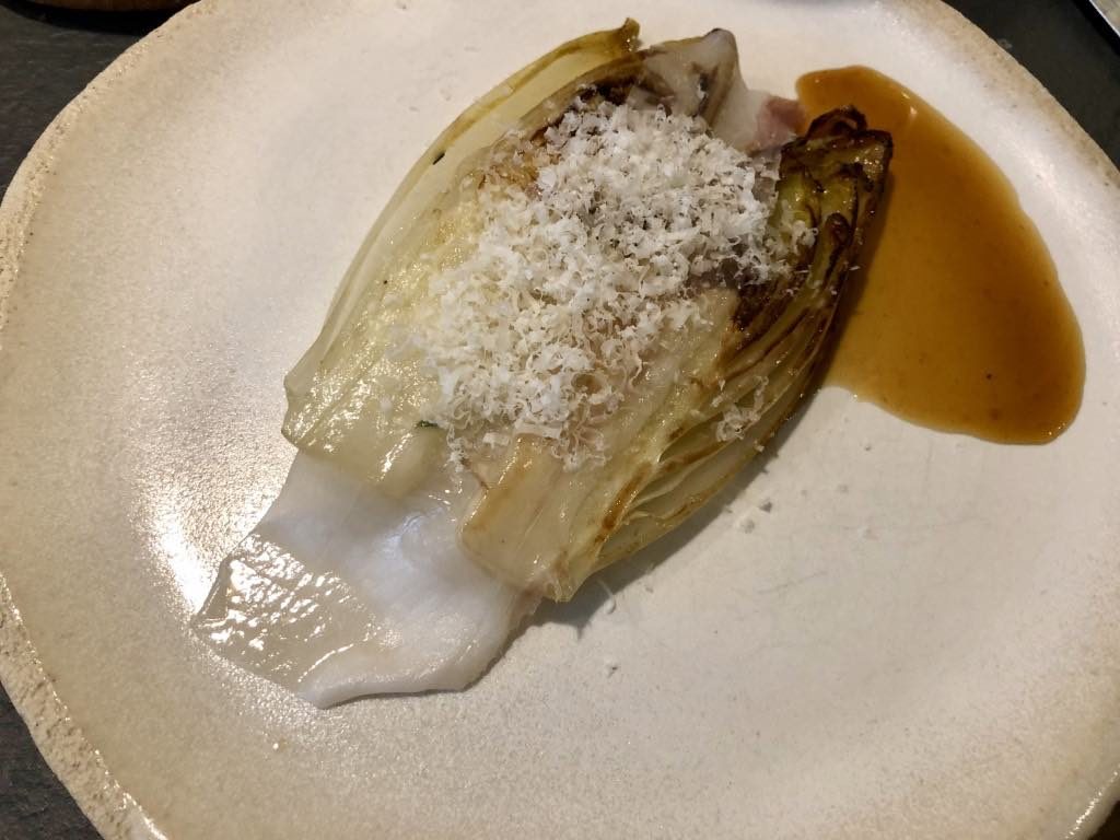 Chef Anne Legrand, who has worked with Gordon Ramsay and Hélène Darroze, likes to cook mainly with vegetables and is able to work magic with them, judging by a recent lunch there. The first course was a very humble-looking plate of endives that were anything but humble on the palate. A sprinkling of a strongly flavored grated pecorino from Sardinia, aged for three years, combined beautifully with the slightly bitter taste of the endives and the meaty flavors of Lardo di Colonnata and a poultry reduction. This was a dish that revealed its flavors gradually and was surprisingly delicious and satisfying.