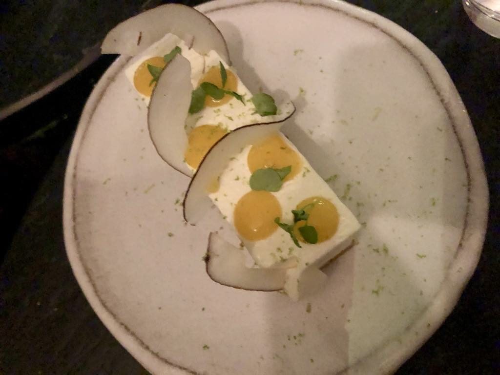 On the advice of the owner, we also tried the extremely light cheesecake with mango sauce and paper-thin slices of coconut. Another sublime dish.