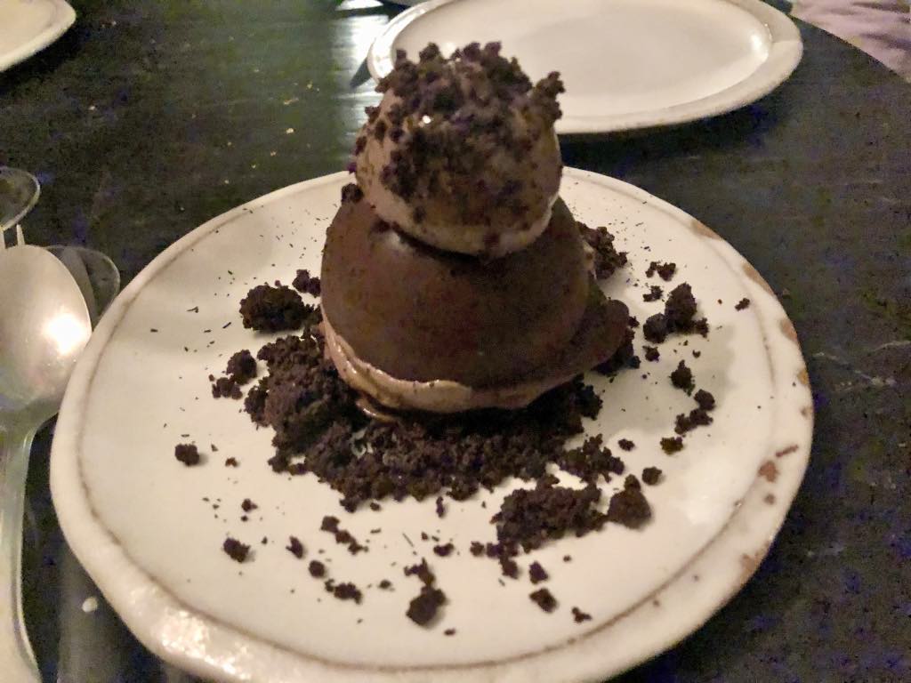 Although no one was very hungry at this point, we had to try the desserts. The deconstructed chocolate tart with tonka beans and sencha tea was indescribably good, but I’ll try: the rich chocolate cream was of such high quality that it left no cloying aftertaste in the mouth as some lesser chocolate does. The tonka beans and sencha tea gave it a lovely tang, while the brilliant chocolate crumble added crunch and a different chocolate flavor. I could eat this every day.