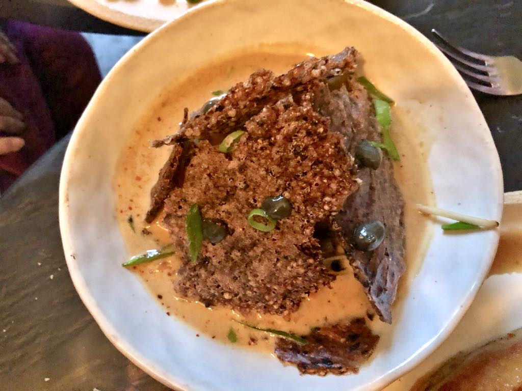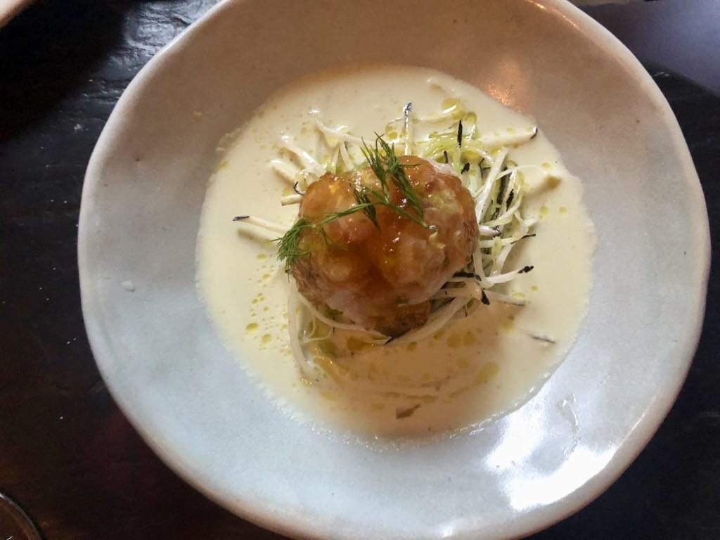 The third dish, Thai-style gambas with coconut-flavored broth and black puffed-rice crackers, was no slouch either. Hard to stop eating it and spooning up the sauce.