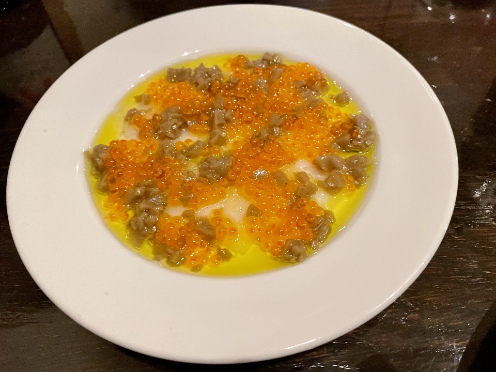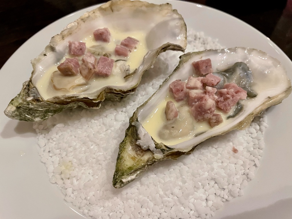 As an amuse-bouche, we each had a fantastic oyster with bits of smoked sausage and béchamel sauce, which had been passed under the kitchen‘s Japanese barbecue. Highly recommended.