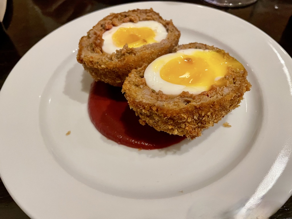 Our first dish was something you don’t often see in a Paris bistro, and a real winner: a scotch egg. The perfectly cooked egg was swaddled in a thick crust of fine smoked sausage meat from the Jura and set atop a delicious beetroot sauce whose mild, slightly sweet flavor was the perfect complement to the sausage meat.