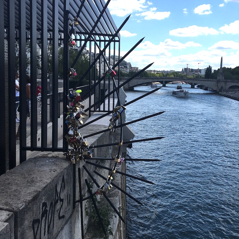 In about 2010, it became a fad for couples to put a padlock on the wire mesh railings of the Pont des Arts, a footbridge across the Seine in central Paris, as a symbol of their undying love, which supposedly would last as long as the lock. Or at least long enough for a night of post-padlock-celebration sex.