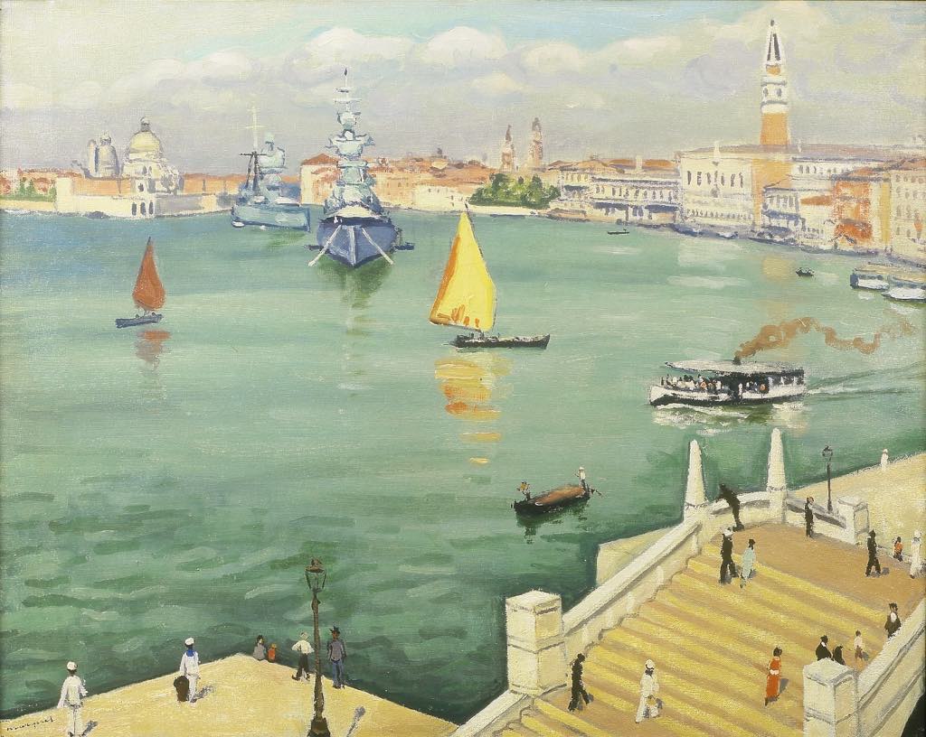 Like Monet, Marquet often depicted the same scene in different weather, lighting conditions, seasons and times of day, always trying to get them right in his search for “authenticity.” The predominant colors are watery greens and blues, but there is often a vibrant patch of contrasting color livening up the scene: a yellow sail, for instance, as in “Battleships, Venice” (1936), in which the cheery sailboat contrasts with the grim threat of the hulking warships behind it.