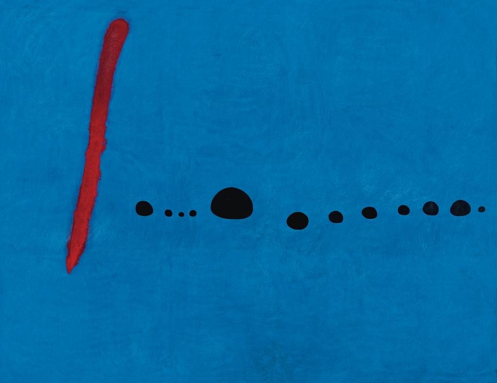 Fantastic creatures and shapes continued to populate his works for the rest of his life, but toward the end, the paintings, which became monumental once he had a studio large enough to accommodate them, started to veer toward minimalist abstraction, as in the trilogy of “Blue” paintings from 1961 (one of them is pictured at the top of this page). Miró called these three paintings “the culmination of everything I have tried to do.”