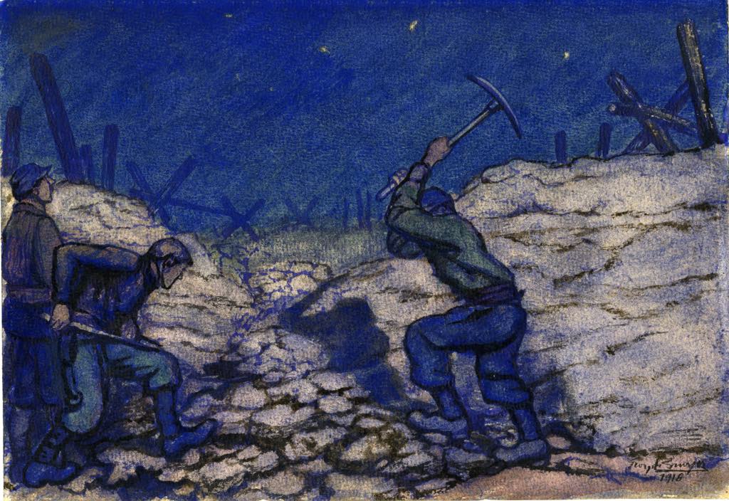 One of those soldiers out there in the trenches was the artist Georges Bruyer, whose colorful engravings and drawings are the subject of the exhibition “Graver la Guerre” (through August 22, 2021). With portraits of individual soldiers, scenes of post-battle devastation and daily life in the trenches, he captured not so much the horrors of battle, but the horrors of waiting in suspense for the battle to occur.