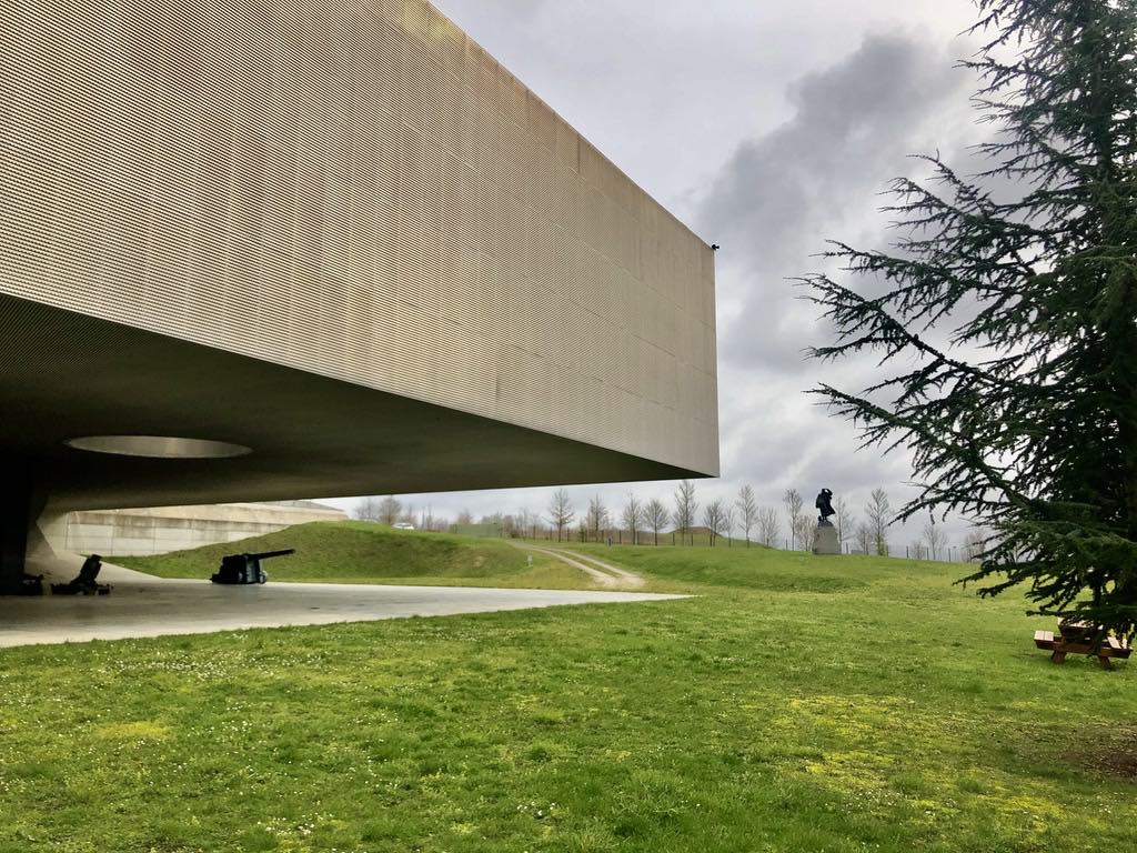 The museum itself, located on a grassy rise in the middle of the site of the first battlefield of the Marne, is a striking sight as you approach it from the road. The long, horizontal concrete, glass and metal structure cantilevers out of the ground like a torpedo aimed at the horizon, its shiny surface gleaming in the light. The sleek modernity of the building designed by Christophe Lab contrasts with the monumental statue “Liberty in Distress,” by Frederick William MacMonnies, a gift to France from the United States, a sort of quid pro quo for the Statue of Liberty, symbolically made of pierre de Lorraine and placed at the point on the battlefield where the German advance toward Paris was halted in September 1914.