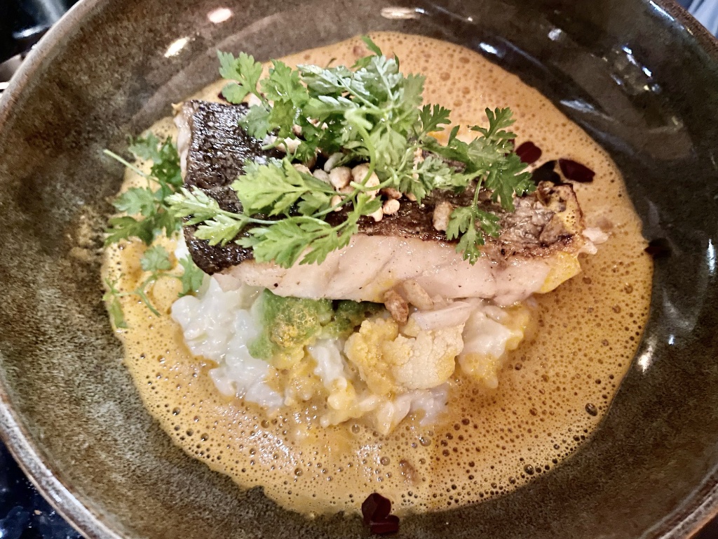 He followed that with the catch of the day, maigre (meagre), served with risotto, tarragon-flavored bisque, cauliflower and puffed rice with Parmesan cheese. Another subtle blend of flavors, which he found highly pleasing.