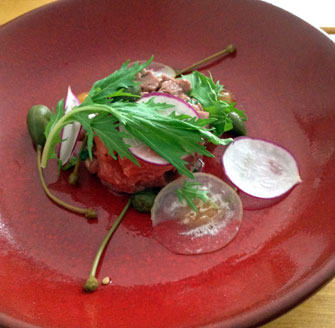 luscious. I had the amazingly good duck tartare, with mostarda sauce, bits of pink grapefruit, and some big, fat capers. This was a divinely balanced dish. I would return just to