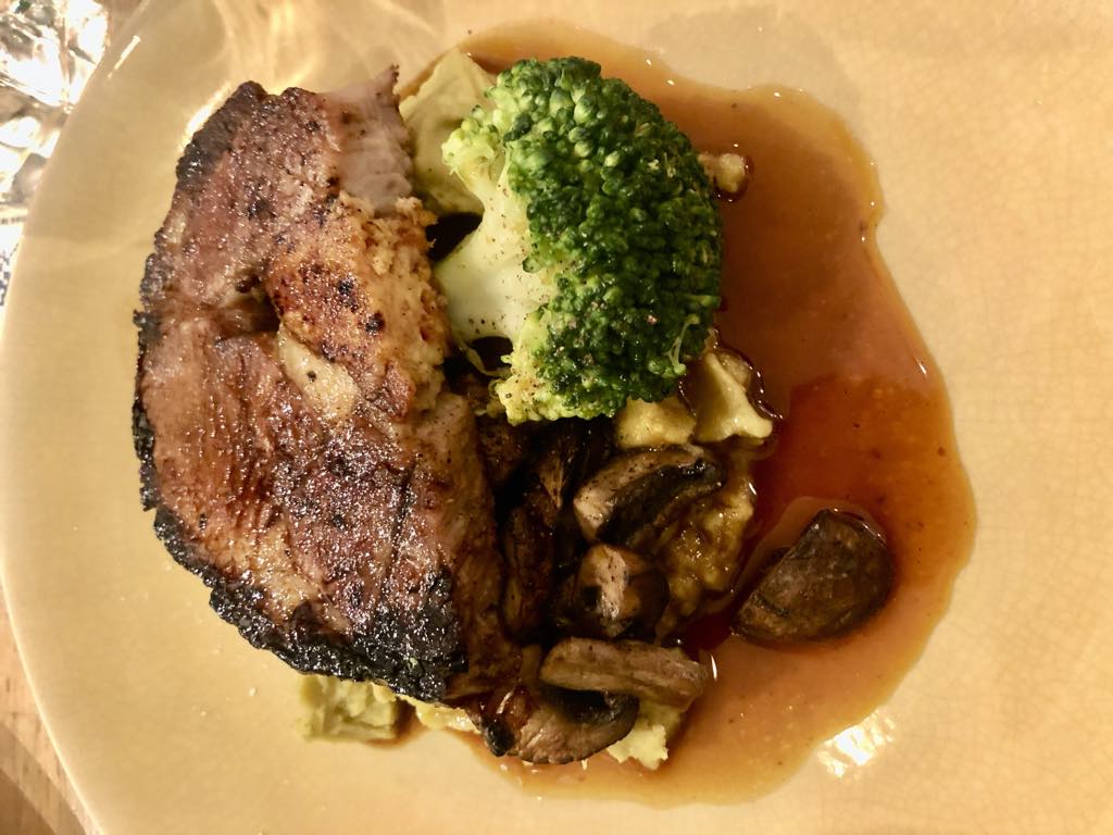 The pièce de résistance was the meltingly tender and flavorful glazed pork belly, slightly charred, with split-pea purée, scrumptious mushrooms and a bit of broccoli.