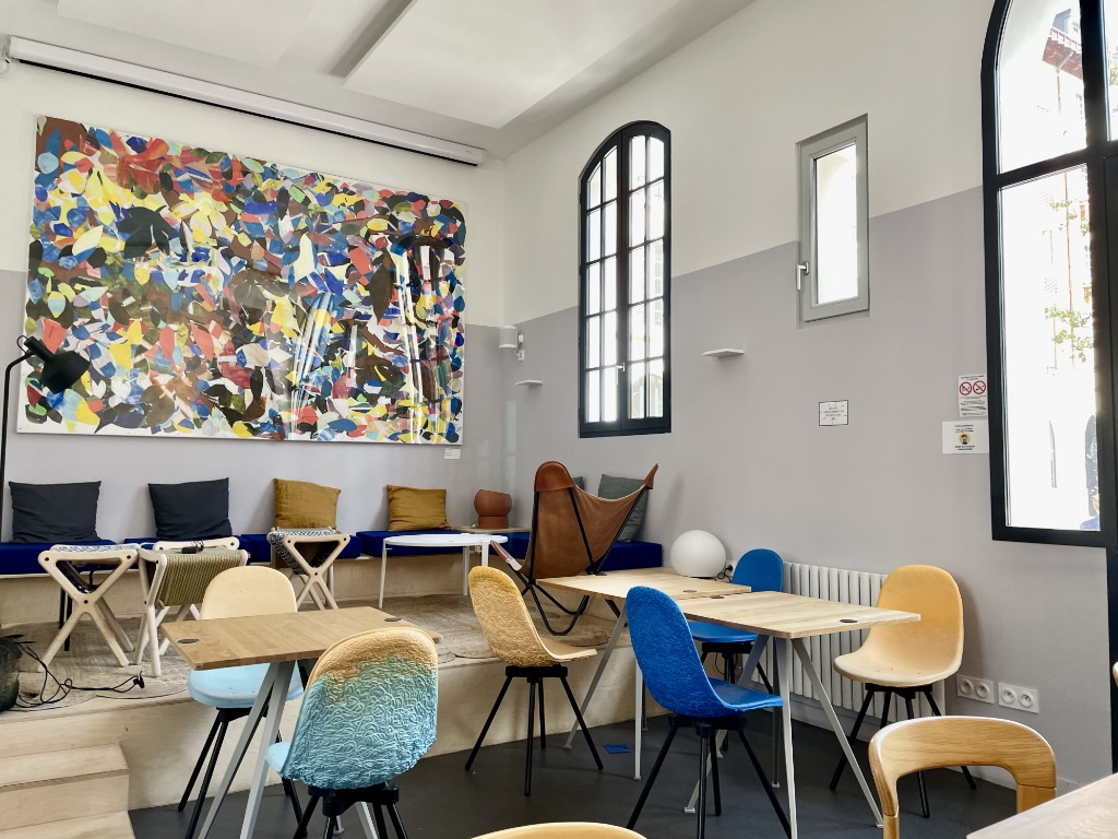 Customers are asked to place their order at the counter before taking a seat on the terrace or in the dining room, with its handsome paned windows looking out onto the Jardin Arnaud Beltrame, a newly added public garden named for a heroic French police officer who traded places with a hostage during a terrorist attack and died as a result of the injuries he sustained. One wall is decorated with a huge, cheerful artwork and another with a temporary exhibition of photographs by singer/songwriters Vincent Delerm.