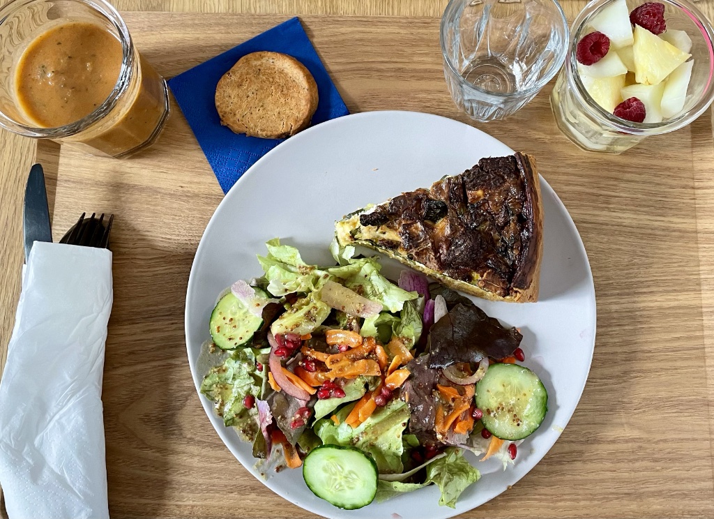 I was impressed not only with Notre Café’s food, setting and mission, but also the attention paid to detail. Once you have placed your order at the counter, you are given a “lollipop” stick with a number to indicate where your food should be delivered. Standard, but here you can be sure that it won’t be knocked over since it clicks onto to one of the two magnets built into the table. Soundproofing panels on the ceiling guarantee peace and quiet in the dining room (why doesn’t the city of Paris make them a requirement for every restaurant?). Outside on the terrace, extra tables and chairs ensured that everyone who wanted to enjoy the fresh air and sunshine would be accommodated.
