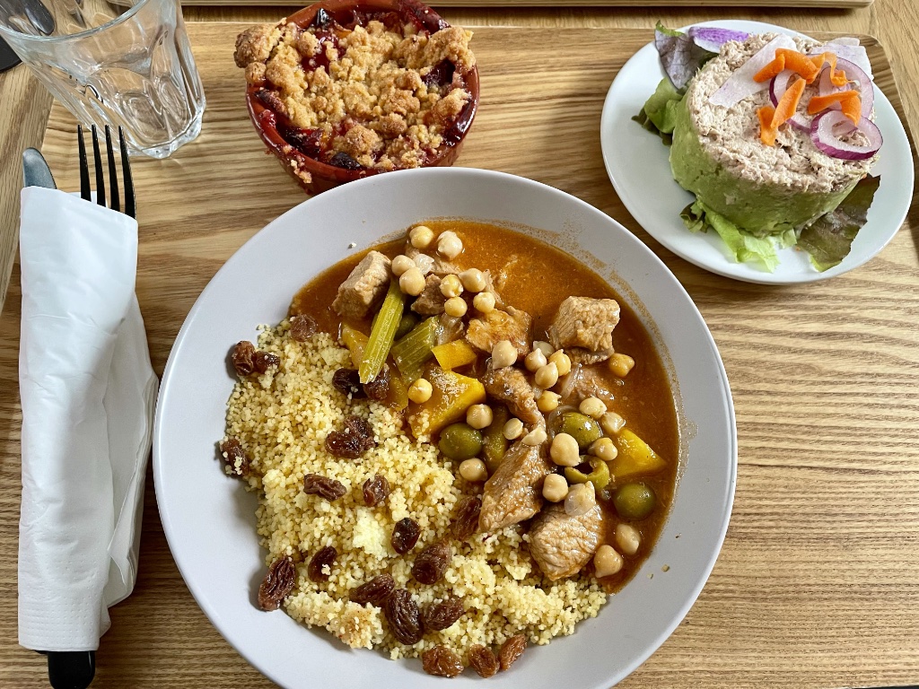 I went for the formule (fixed-price menu) – three courses for €18 – and was amply rewarded with a dish of tuna and mayo ingeniously melded with a base of creamy avocado. That was followed by the only hot dish on the menu, a wonderful tagine with tender chunks of veal, semolina, citron confit (preserved lemon), green olives, raisins and turnips. For dessert, a delicious apple and plum crumble – perhaps a tad too sweet for my taste but otherwise perfect with its crispy crumble topping