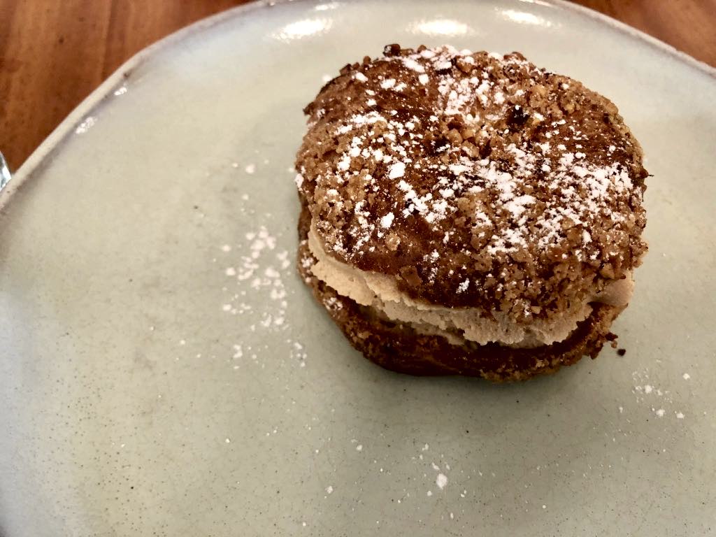 For dessert, we shared a perfect Paris-Brest (chou pastry with praline cream), creamy and rich, rather than the healthier options of sautéed plums with yogurt and granola or melon with ginger sorbet and verbena meringue.