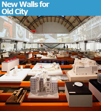 Detailed, easy-to-read information on each model is provided on large plasticized sheets hanging over the edge of the railing. They include a picture of the model to make it easy to spot and a photo of the actual building today, allowing for comparisons between intention and reality. Other projects are presented more traditionally in the surrounding spaces, with models and drawings and some interesting videos of architects being interviewed about or presenting particular projects.