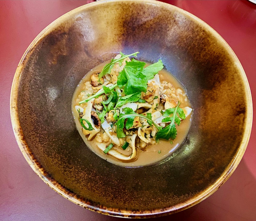 My friends had the only other starter on offer, the rich and delicious “blé ‘Engrain’ Cucugnan,” a tangy bisque with cuttlefish, einkorn wheat from Cucugnan and ‘nduja (spicy sausage), showing off the chef’s talent for felicitously introducing unlikely ingredients to each other.
