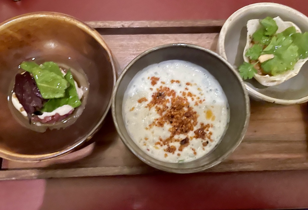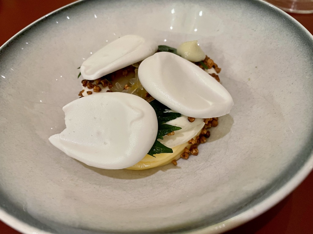 The feast ended with three luscious desserts full of seasonal flavors and more surprising combinations of ingredients: butternut ice cream with Tannea chocolate, pumpkin-seed praline, walnut-wine syrup, and chestnuts; pear with diplomat cream (custard mixed with whipped cream), lemon, citron and shiso, topped with meringue; and an apple/quince concoction with raw cream and marigold sorbet.