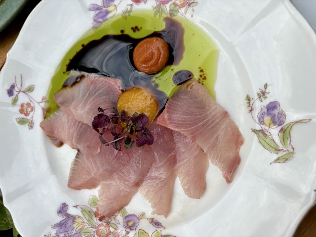 Next came salmon sashimi with stracciatella, wasabi, ginger and shio kombu (salted kelp), followed by a fish I was unfamiliar with, seriole (greater amberjack) with gochujang miso, kumquat and ponzu sauce. Both were perfectly seasoned and cooked (in the case of the seriole), with wonderfully complementary flavors, including a touch of fruity sweetness.