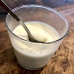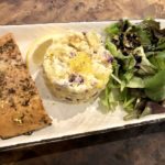 The main course that followed was a wonderful piece of salmon, hot-smoked but served cold, accompanied by a tasty potato salad, topped with little beads that looked like fish roe but were filled with lemon, and fresh greens with a good vinaigrette. This salmon was the only product on offer that did not come from Brittany (because it’s better in Scotland, the waiter explained).