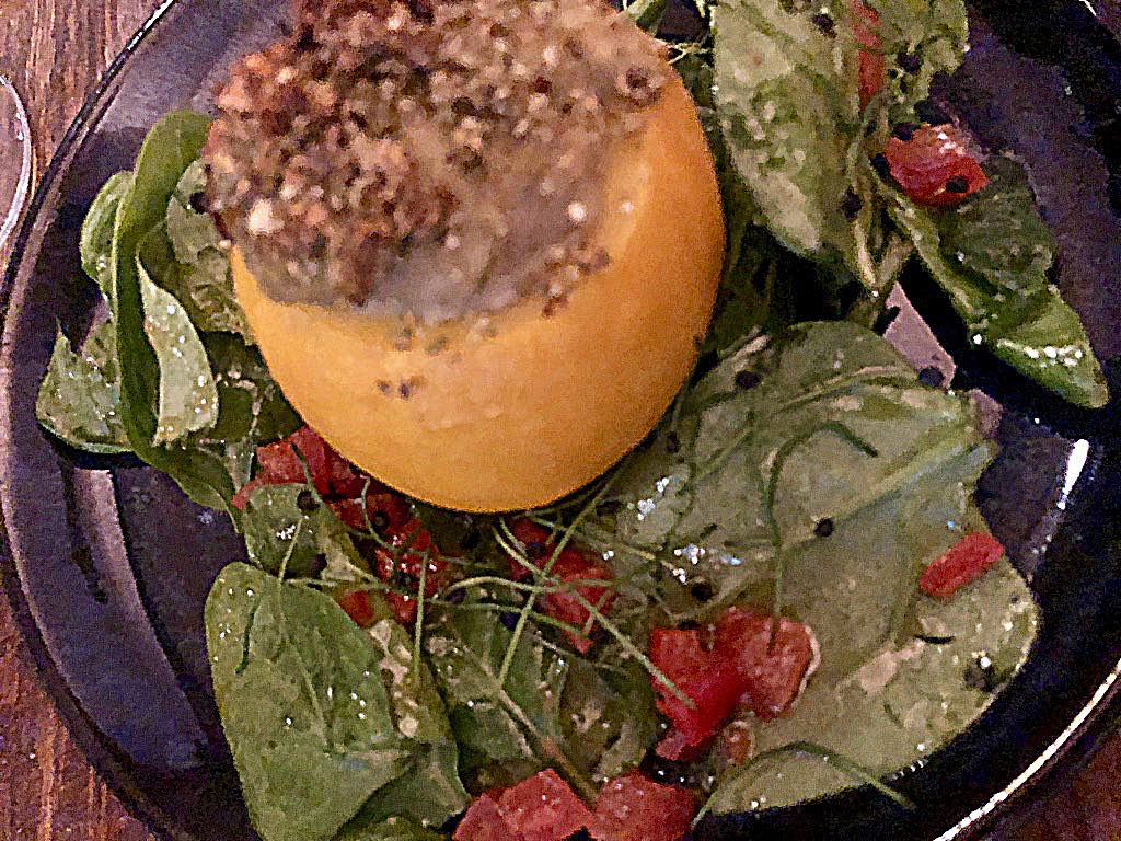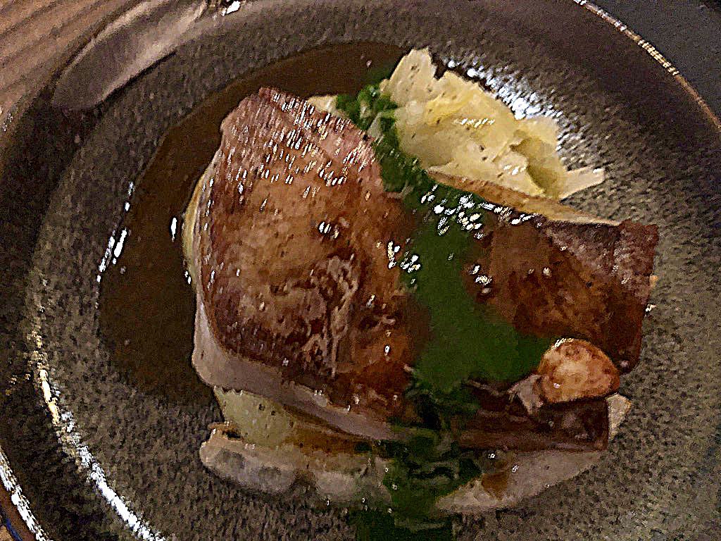 The third starter was a small round squash stuffed with a cod mixture. In spite of a list of interesting ingredients – eggplant with wild garlic, kaffir lime and baby spinach with curry-flavored oil – my friend found it rather bland.
