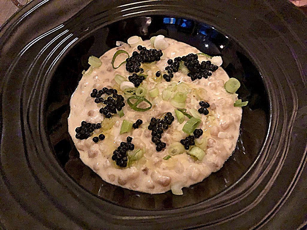 The best main course was the fregola risotto with white-truffle cream, black-truffle “perles de jus” and green onion, topped with fish roe and Parmesan.