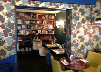 The impression I had from those reviews seemed to have been completely wrong: when I entered, the first thing I noticed was a musty smell in the bar area with a few tables. The second thing was the dirty, torn red carpeting on the stairs. The restaurant only opened a year ago, so the new owners must have kept the furnishings of the previous tenant. I mounted the stairs to the dining room, which was prettier, especially the back room with its bookshelf-covered walls and Vivienne Westwood flowered wallpaper, but the fabric on the banquette where Lisa was waiting was also well-worn.