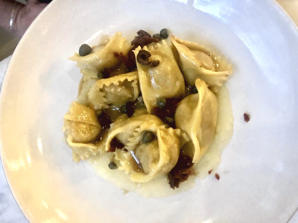 The homemade rabbit-stuffed ravioli with potato cream, olives, capers and tomatoes was pleasingly gamey.