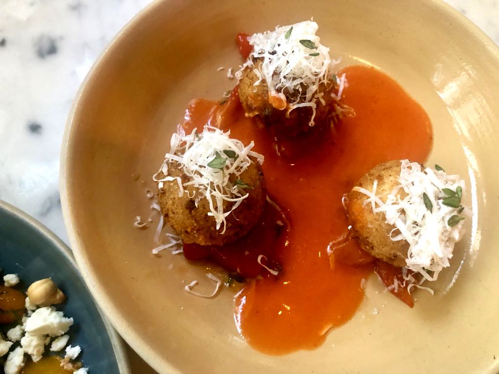 The deep-fried ricotta balls were light as a feather (unlike their more commonly seen cousin, mozzarella fritta), without the slightest trace of grease. They were paired with a luscious red-pepper sauce.