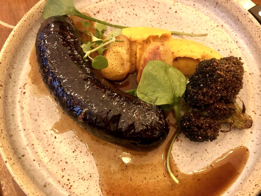 The plump and tasty Basque-style blood sausage (prepared with meat and leeks) was sprinkled with Espelette pepper and served with a marvelous horseradish cream, butternut purée and crispy fried broccoli (a delightful surprise), a watercress salad and melt-in-the-mouth baby potatoes.