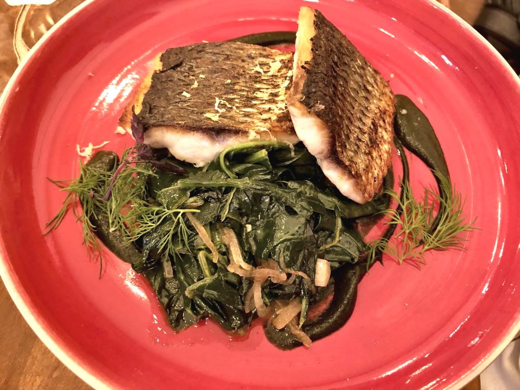 The fish course was a fine mullet served with sautéed spinach and slow-cooked fennel.